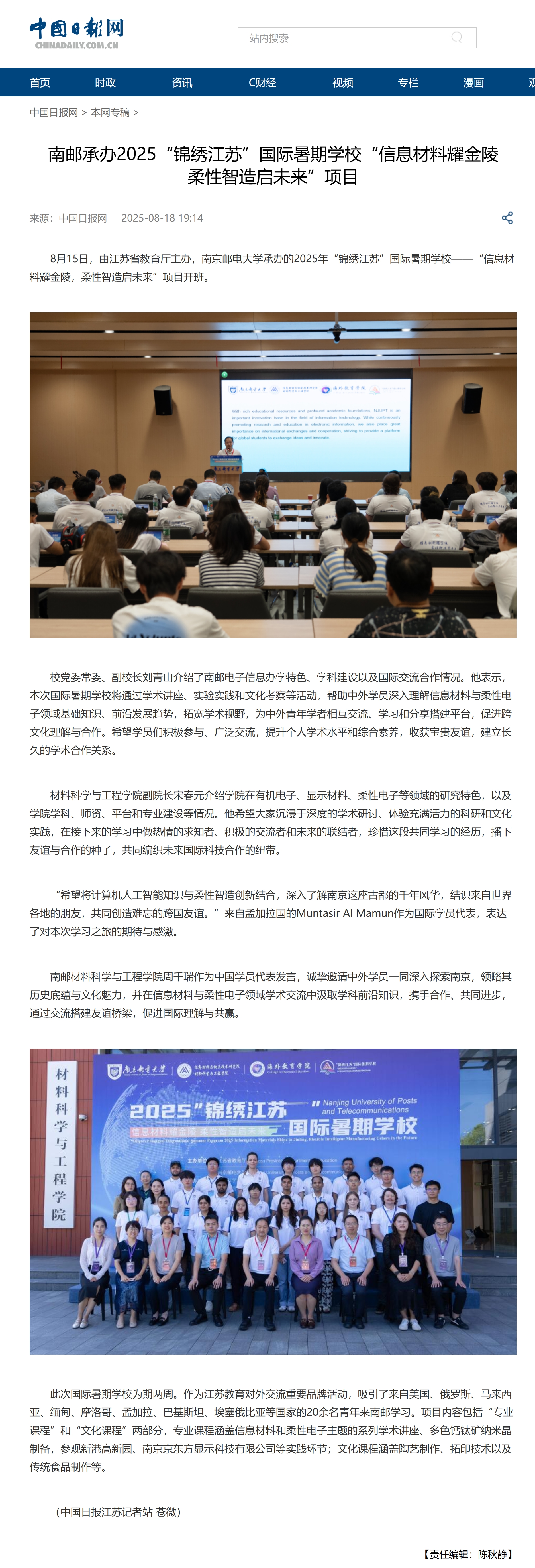 【中国日报网】南邮承办2025“锦绣江苏”国际暑期学校“信息材料耀金陵 柔性智造启未来”项目