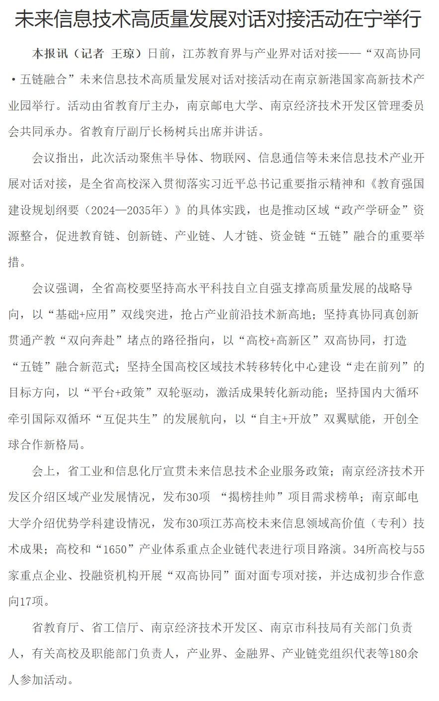 【江苏教育报】未来信息技术高质量发展对话对接活动在宁举行