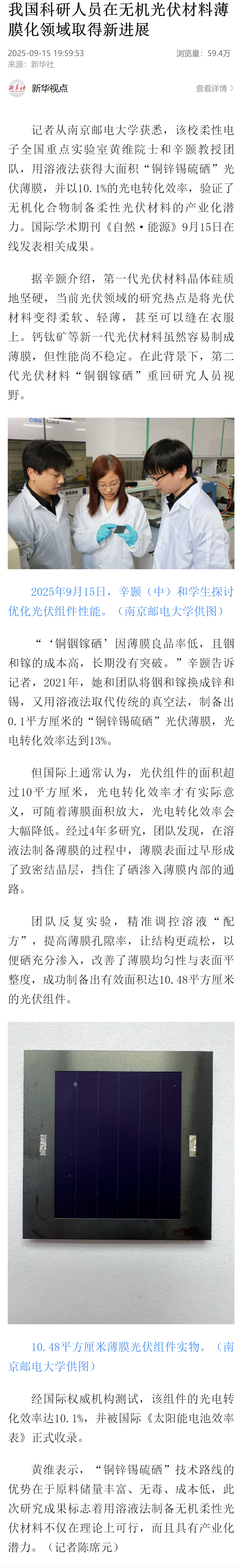 【新华社客户端】我国科研人员在无机光伏材料薄膜化领域取得新进展