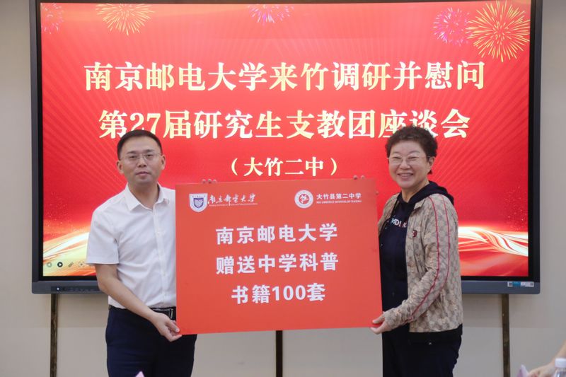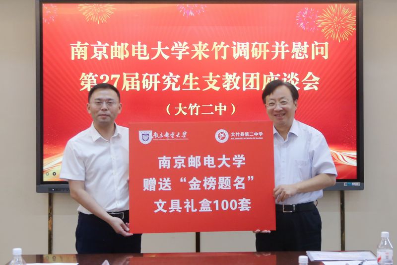 调研座谈会上,南邮向大竹二中赠送中学科普读物100套、“金榜题名”文具礼盒100套,用于支持学生学习成长,传递南邮师生对竹乡教育事业的持续关怀。