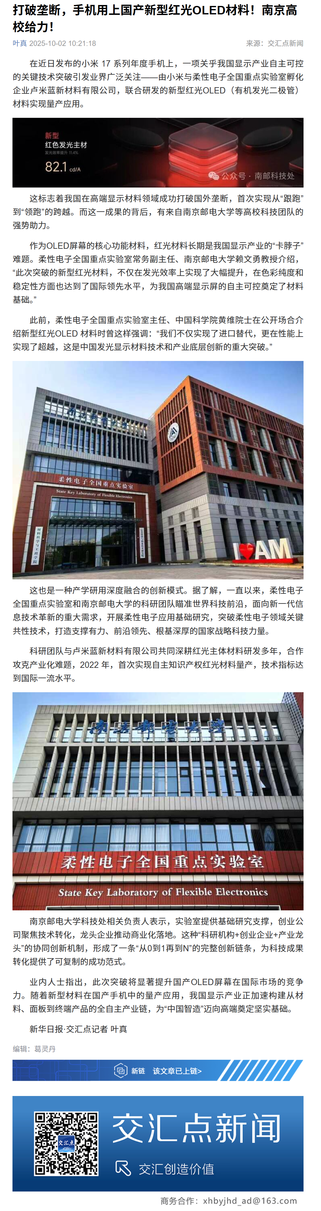 【新华日报客户端】打破垄断,手机用上国产新型红光OLED材料!南京高校给力!