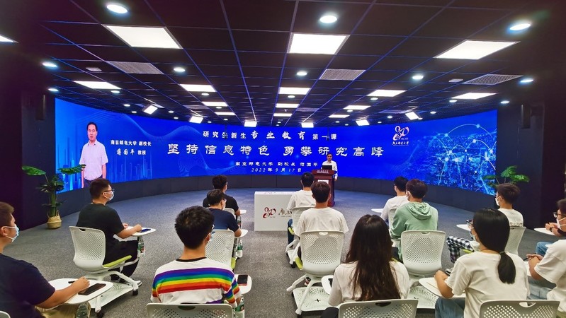 坚持信息特色,勇攀研究高峰。校党委常委、副校长蒋国平教授以此为题于9月17日为研究生新生上专业教育第一课。蒋国平副校长向同学们介绍了我校研究生教育的发展历程、主要成效和信息特色,对研究生新同学提出四点要求:一是守求真之本、厚德以修身,二是拓求新之路、弘毅以自强,三是秉求是之风、志高以行远,四是扬求合之帆、笃行以致远,并勉励2022级研究生传承“信达天下,自强不息”的南邮精神,在科学研究的道路上,志存高远,敢于担当,坚持信息特色,勇攀研究高峰,以优异成绩迎接党的二十大胜利召开。