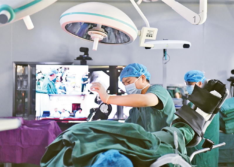 数字技术与医疗、农业、能源、建筑、服务业等紧密结合,正在推动传统产业日益高端化、智能化。图为2021年4月19日,拉萨市人民医院骨科医生在北京积水潭医院专家远程指导下,使用骨科机器人开展骨科手术。新华社记者 孙瑞博 /摄