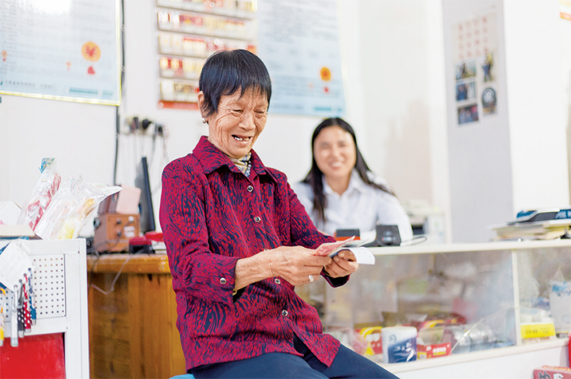 我国成功建设了具有鲜明中国特色、世界上规模最大、功能完备的社会保障体系。图为江西省遂川县草林镇拱前村82岁脱贫户黄茂香在“社保村村通金融服务便民点”支取养老金,该县在286个村设立此类便民点,实现了所有老人不出村就可轻松支取。 中国社会保障杂志社供图 高敏/摄