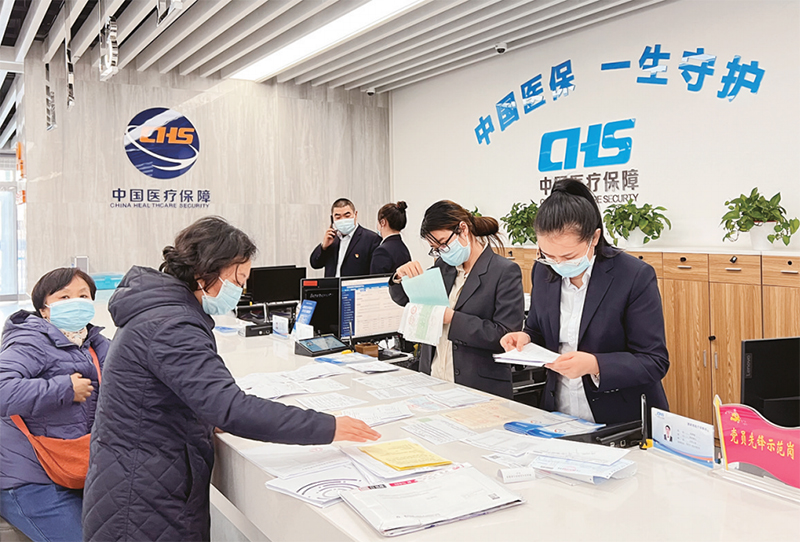 中国用较短时间建立起世界最大的全民基本医疗保障网,对破解群众看病难看病贵问题、支持医药卫生事业发展、维护社会稳定和推动共同富裕发挥了重要作用。图为2022年3月1日,甘肃省酒泉市医保经办窗口工作人员正在为群众办理医保业务。 国家医疗保障局供图 郑惠亚/摄