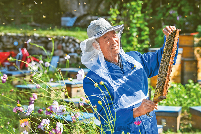 共同富裕要靠勤劳智慧来创造。山西省大同市灵丘县充分发挥自身资源特色和优势,走上了生态优美、产业兴旺、生活美好的“农业+旅游”致富路。图为2021年9月23日,灵丘县边氏养蜂专业合作社社员在检查蜂箱情况。 新华社记者 柴婷/摄
