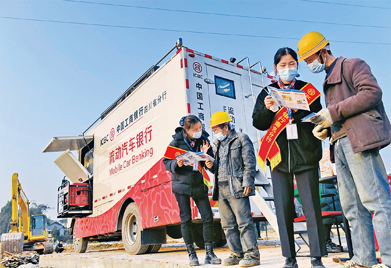 服务实体经济是金融的天职和宗旨,也是防范化解金融风险的根本举措。中国银保监会持续引导金融机构强化小微企业、“三农”和扶贫等领域金融支持。图为2021年1月14日,在四川省南充市顺庆区金台镇南田寺村的川渝柑橘现代种业园项目建设现场,中国工商银行四川南充分行“流动汽车银行”巴士开进了工地,为农民工制卡、补卡、宣传金融知识等。 中新社发 李向雨/摄