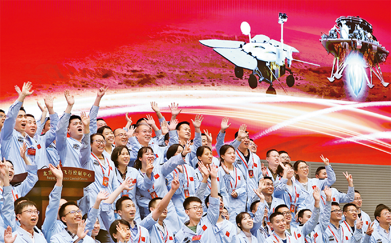 近年来,越来越多的青年人才在科技创新第一线“冒尖”,逐步成为科研主力军。图为2021年5月15日,航天科研人员在北京航天飞行控制中心指挥大厅庆祝我国首次火星探测任务着陆火星成功。 新华社记者 金立旺/摄