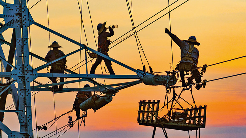 提高人民生活品质是畅通国内大循环的出发点和落脚点,也是国内国际双循环相互促进的重要联结点。图为2022年8月18日,在江苏省镇江市220千伏天王至江宁牵引站线路工程现场,江苏省送变电有限公司施工人员在高温酷暑下加紧建设,全力保障企业生产、居民生活用电需求。