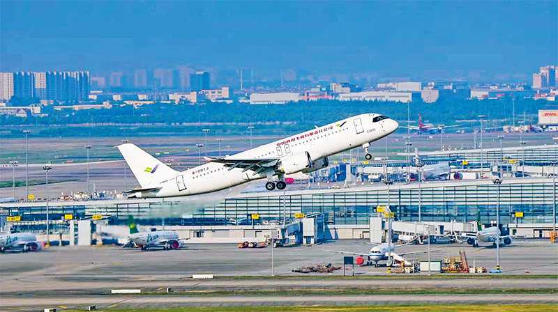 党的十八大以来,我国创新驱动发展成效明显,科技实力正在从量的积累迈向质的飞跃,从点的突破迈向系统能力提升。图为2022年5月14日,编号为B-001J的C919大飞机从上海浦东机场起飞,3小时后安全降落,标志着中国商飞公司即将交付首家用户的首架C919大飞机首次飞行试验圆满完成。