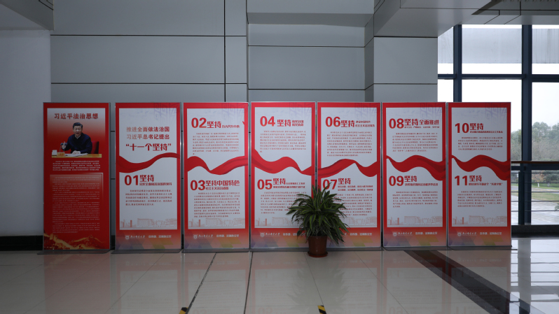 在活动现场,宣传部、法制办公室通过发放宣传材料、宪法讲解、答疑解惑等形式与师生互动交流。校园内也营造了浓厚的贯彻实施宪法的氛围,学校官网主页发布宪法日宣传大图,教学楼、行政楼LED显示屏滚动播放宪法宣传标语,宣传栏张贴宪法宣传海报、悬挂弘扬宪法精神的横幅,制作系列展板,介绍习近平法治思想主要方面的“十一个坚持”,引导师生全面准确把握其精神实质、丰富内涵和核心要义。