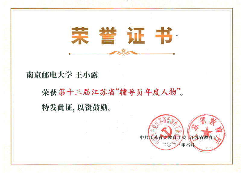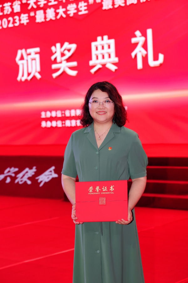 6月18日,由省委教育工委、省教育厅主办的第十三届江苏省“大学生年度人物和高校辅导员年度人物”暨2023年“最美大学生”“最美高校辅导员”颁奖典礼举行。我校计算机学院、软件学院、网络空间安全学院党委副书记、副院长王小露荣获第十三届“江苏省高校辅导员年度人物”荣誉称号。