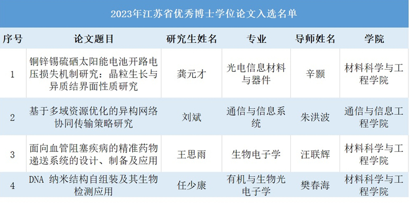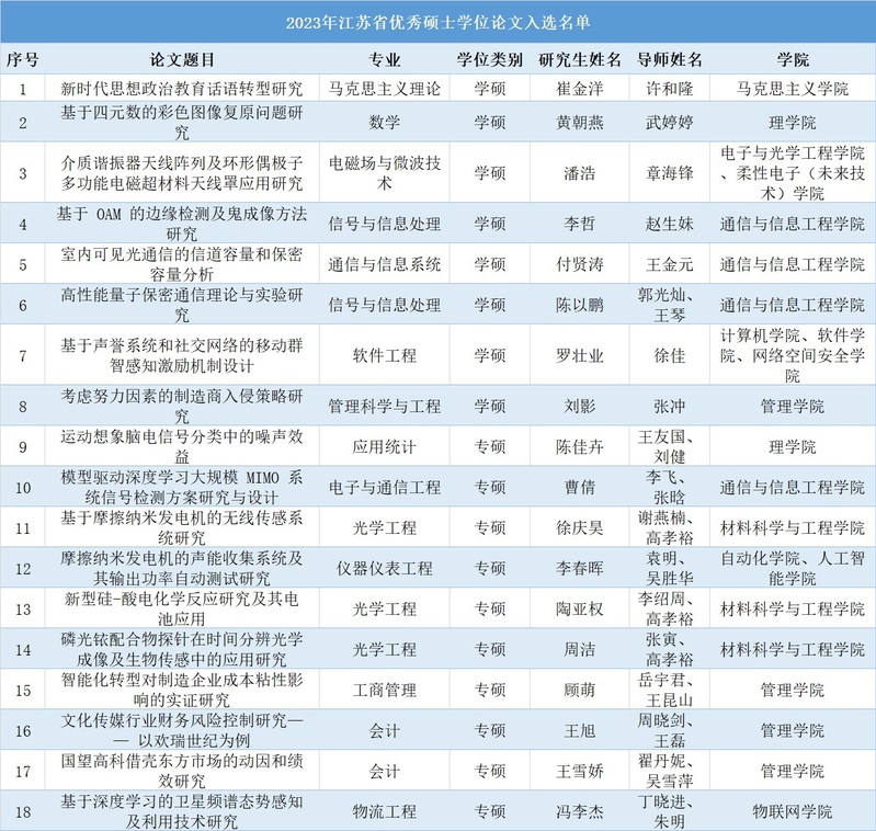 1月4日,接江苏省学位委员会、江苏省教育厅关于公布2023年江苏省优秀博士硕士学位论文评选结果的通知,南邮共22篇学位论文入选,其中优秀博士学位论文4篇、优秀学术学位硕士学位论文8篇、优秀专业学位硕士学位论文10篇。优秀学位论文较去年增加7篇,获评总数和入选率在省属高校中位居第三。