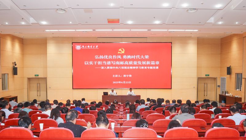 郭宇锋以《弘扬优良作风 勇挑时代大梁 以实干担当谱写南邮高质量发展新篇章》为题,从“全面认识党的作风建设的重要时代意义、深刻感悟贯彻中央八项规定精神的经验启示、持之以恒以作风建设新成效推动学校高质量发展”等三个方面,详尽讲述了中国共产党作风建设的历史进程与经验启示,回顾了当前学校开展深入贯彻中央八项规定精神学习教育的实践做法,深入剖析了学校内涵建设方面存在的短板不足,并结合“十五五”规划制定,系统谋划了今后学校事业发展的方向和思路。