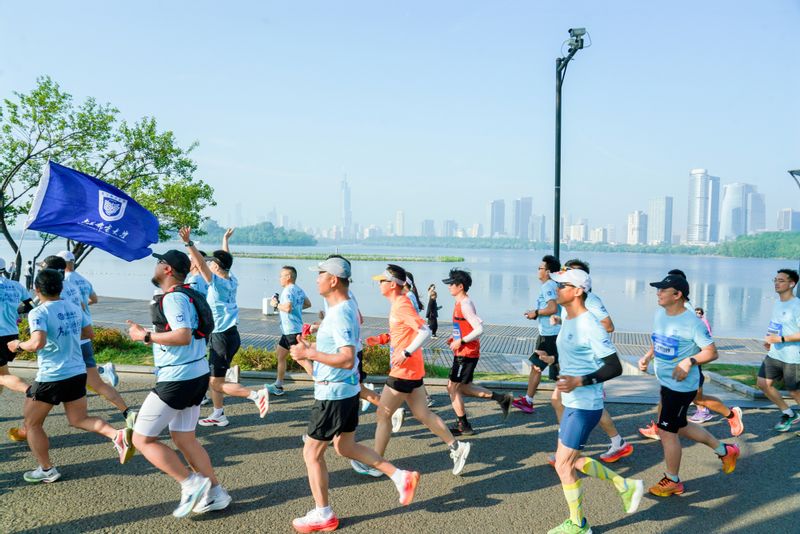 清晨,接力跑、精英跑选手在三牌楼校区蓄势待发。7时整,校长叶美兰打响发令枪,校庆健身跑正式开跑。选手们从三牌楼校区出发,途经锁金村校区,最后在仙林校区汇合,全程共计29公里。