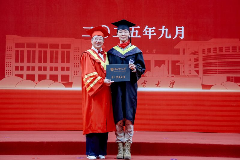 今年六月,学校举办2025届学生毕业典礼,李万芸因参加九三阅兵,未能参加毕业典礼。现场,叶美兰为李万芸授予学士学位。