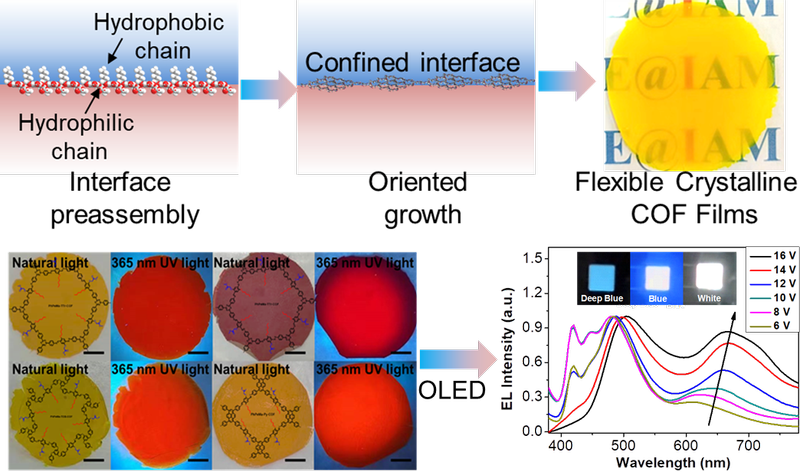 基于此,本研究首次构建了COF基柔性有机发光二极管(OLED)原型器件,其光电转换效率达到同类器件最高水平,且发光颜色可通过电压调控实现从深蓝到白光的连续变化,这为智能动态显示提供了新方案。研究还通过时间分辨SEM、XRD和FTIR追踪了界面预组装定向生长策略下COF薄膜的界面预组装、定向生长与结晶化过程,为理解材料生长动力学提供了实验依据。