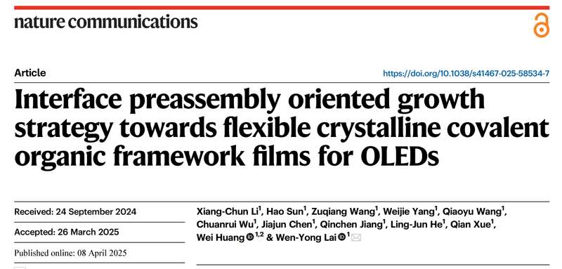 南京邮电大学柔性电子全国重点实验室/化学与生命科学学院赖文勇教授课题组在柔性晶态光电薄膜材料设计制备与功能调控方向取得重要进展,其提出的界面预组装定向生长(IPOG)策略为平衡材料结晶性与柔韧性这一长期科学难题提供了新思路。研究聚焦于共轭有机框架(COF)材料的结构-性能关系,通过分子设计实现了材料光电特性与力学性能的协同调控。相关成果以“Interface Preassembly Oriented Growth Strategy Towards Flexible Crystalline Covalent Organic Framework Films for OLEDs”为题发表于《自然·通讯》(Nature Communications, 2025, 16, 3321)。