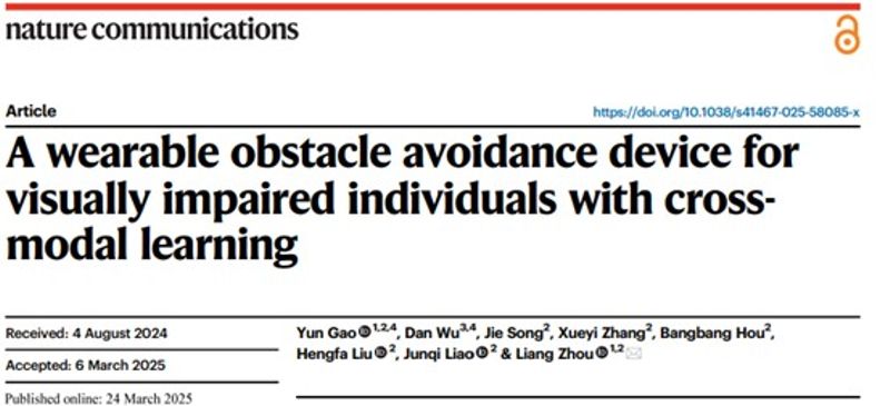 近日,南京邮电大学宽带无线通信与传感网技术教育部重点实验室、通信与信息工程学院青年教师高赟博士,在通信、可穿戴技术、人工智能交叉领域取得最新研究进展。相关研究成果以“A Wearable Obstacle Avoidance Device for Visually Impaired Individuals with Cross-Modal Learning”为题发表于国际学术期刊Nature Communications。该研究聚焦于视障人群辅助出行问题,提出一种融合多模态数据处理与跨模态学习的可穿戴避障设备,显著提升了出行避障的可靠性、响应速度、续航时间以及用户友好性。