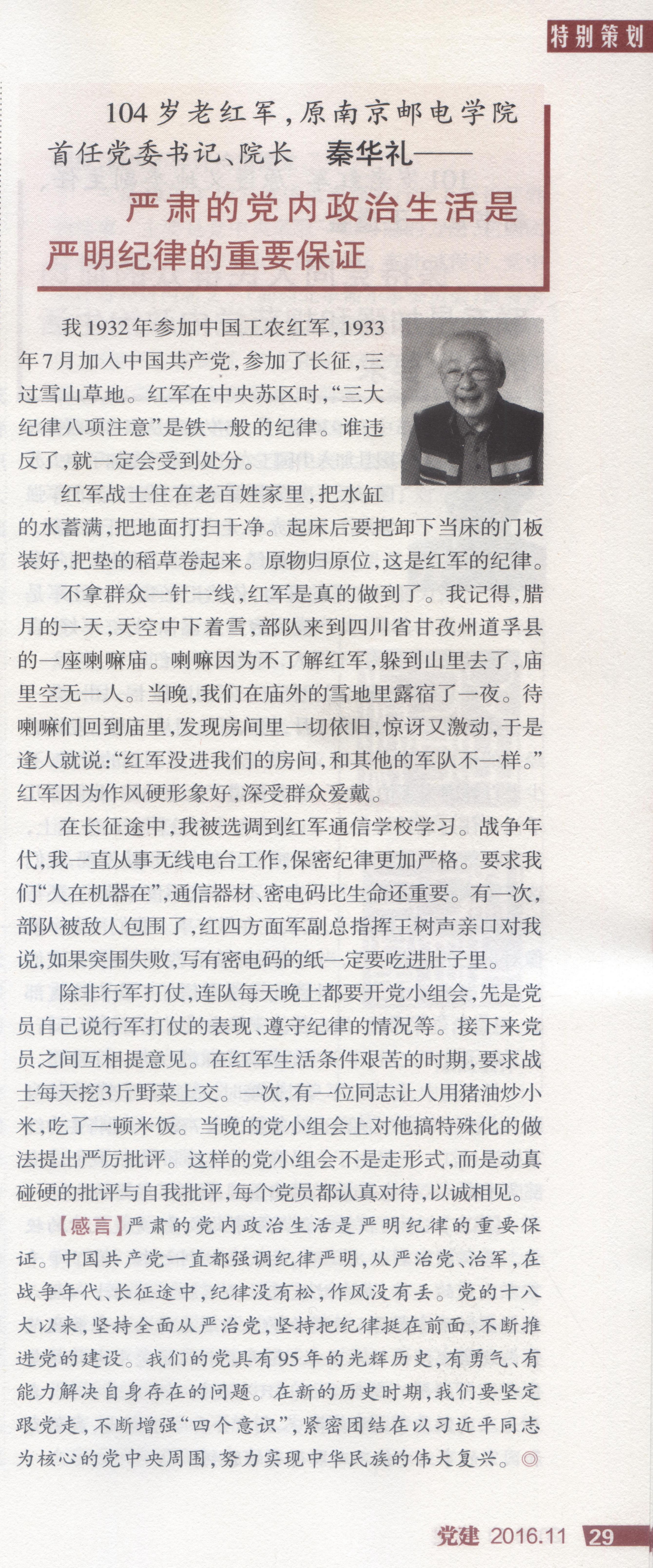 ——2016年第10期《党建》杂志:革命人永远是年轻—记104岁的老红军、原南京邮电学院首任党委书记兼院长秦华礼
