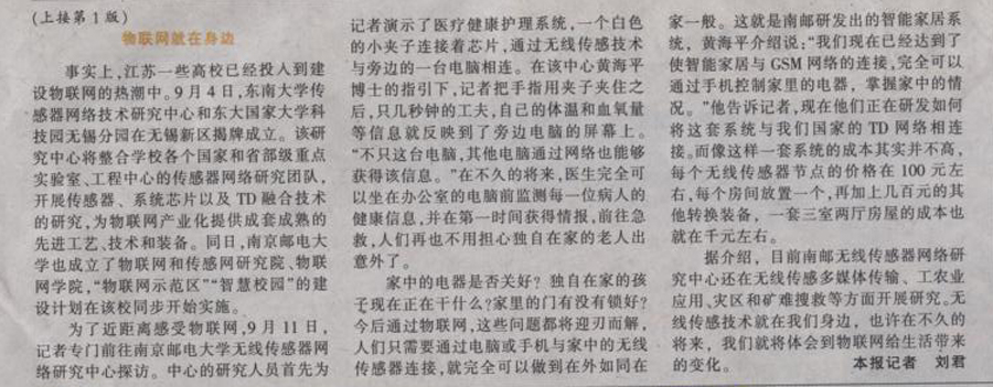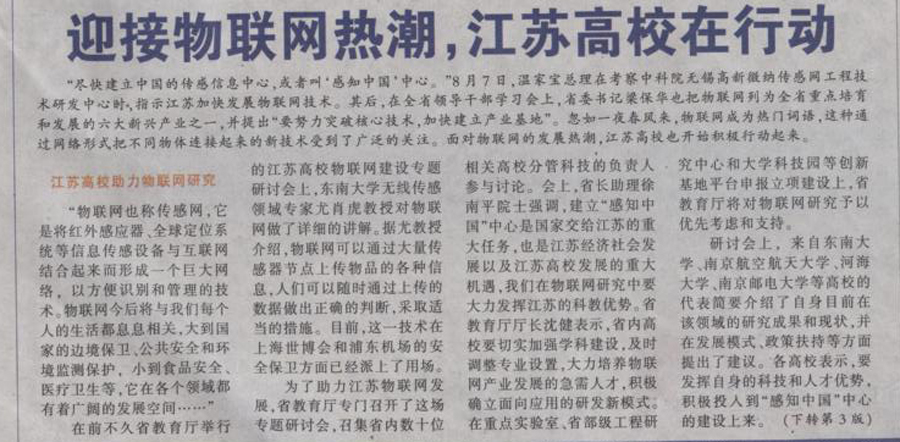| 【江苏教育报】迎接物联网热潮 江苏高校在行动 |