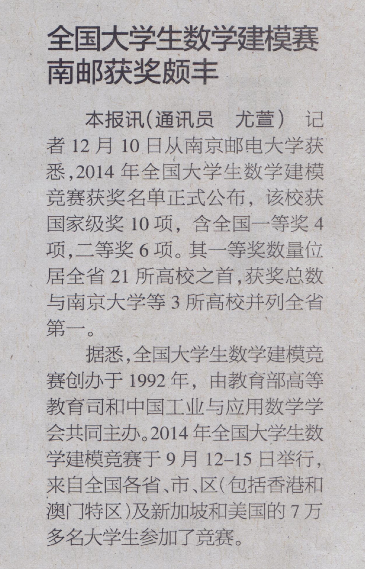 | 【江苏教育报】全国大学生数学建模赛南邮获奖颇丰 |