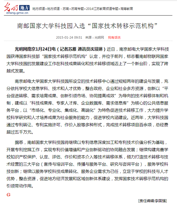 | 【光明网】南邮国家大学科技园入选“国家技术转移示范机构 |