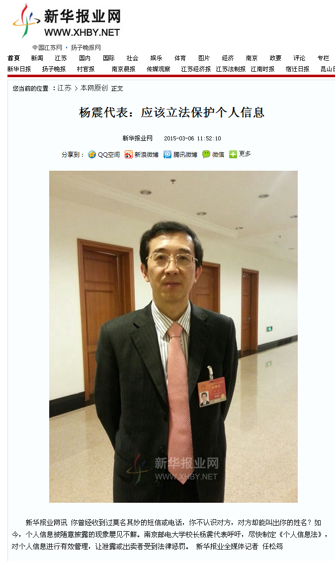 | 【新华报业网】杨震代表:应该立法保护个人信息 |