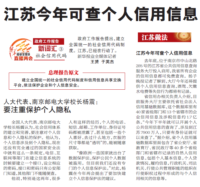 | 【扬子晚报】江苏今年可查个人信用信息 |
