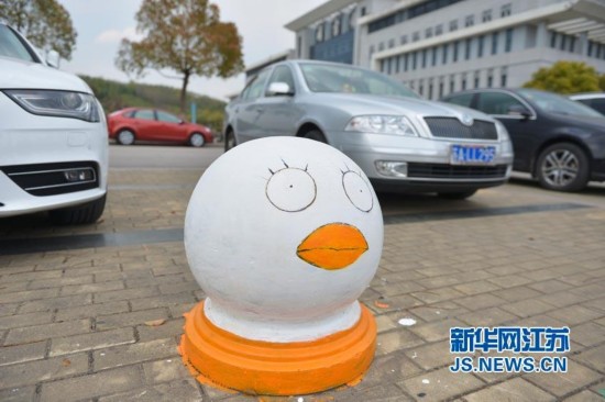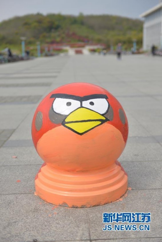 南京邮电大学内的“愤怒的小鸟” 大白、海绵宝宝、哆啦A梦……近期,南京邮电大学的学生发现,校园里又增加了一大波可爱的卡通形象路障球。 去年夏天,南邮的学生们曾创作过一组以多啦A梦造型涂鸦的路障球,迅速走红网络。近期,为迎接学校校庆,智慧灵巧的小伙伴们又在路障上涂鸦了大白、海绵宝宝等形象,再掀校园“萌潮”。这些萌萌的路障球均出自传媒与艺术学院的二十多位同学之手。该院学生会主席朱林同学介绍说:“一个路障球需要花上4个小时才能装扮好。同学们积极性很高,从4月11日上午九点就开始画了。” 目前,这70多个路障球分布在学校图书馆、教学楼、南大门等三个区域,展现了学校形象、青春、运动、安全等主题,成为一道靓丽的风景线。