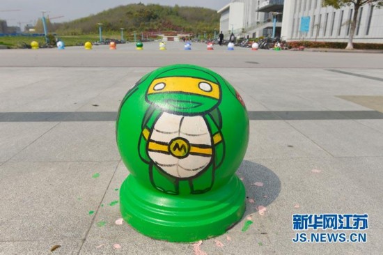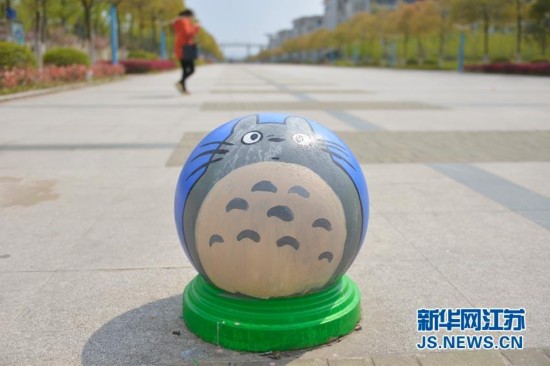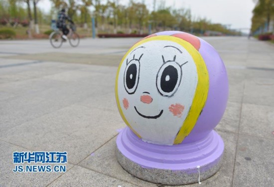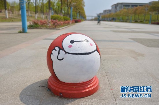 走进南京邮电大学正门,直走约300米就能看到画有各式“卡通萌宝”的路障球。
