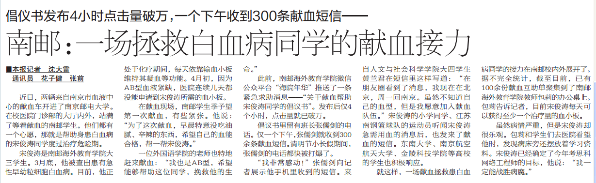 | 【中国教育报】南邮:一场拯救白血病同学的献血接力 |