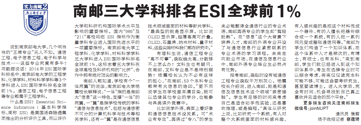| 【扬子晚报】南邮三大学科排名ESI全球前1% |