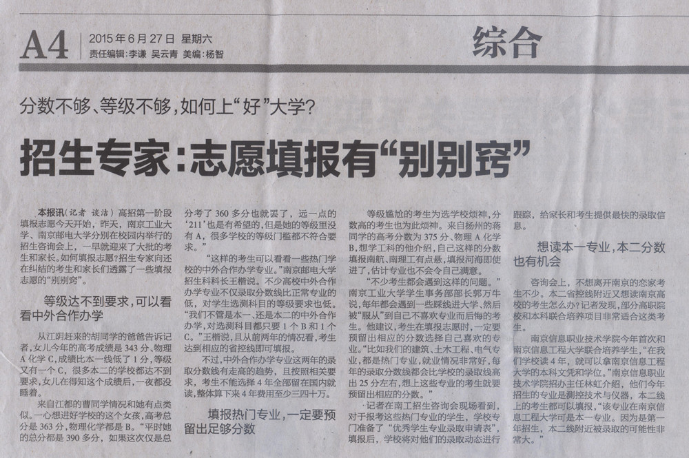| 【南京日报】招生专家:志愿填报有“别别窍” |