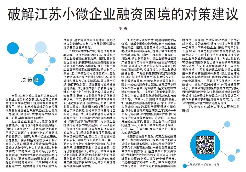 | 【新华日报】破解江苏小微企业融资困境的对策建议 |