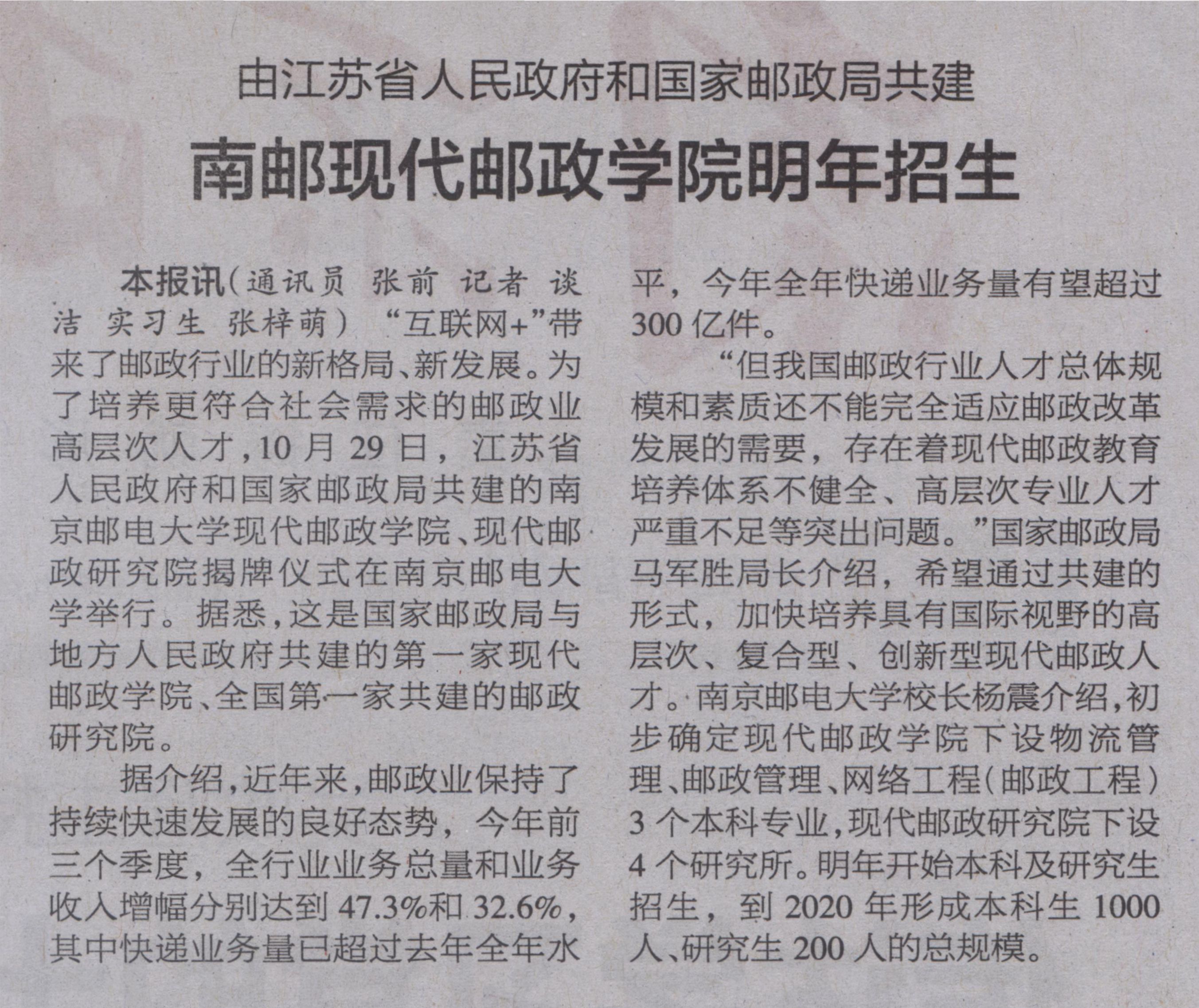 | 【南京日报】南邮现代邮政学院明年招生 |