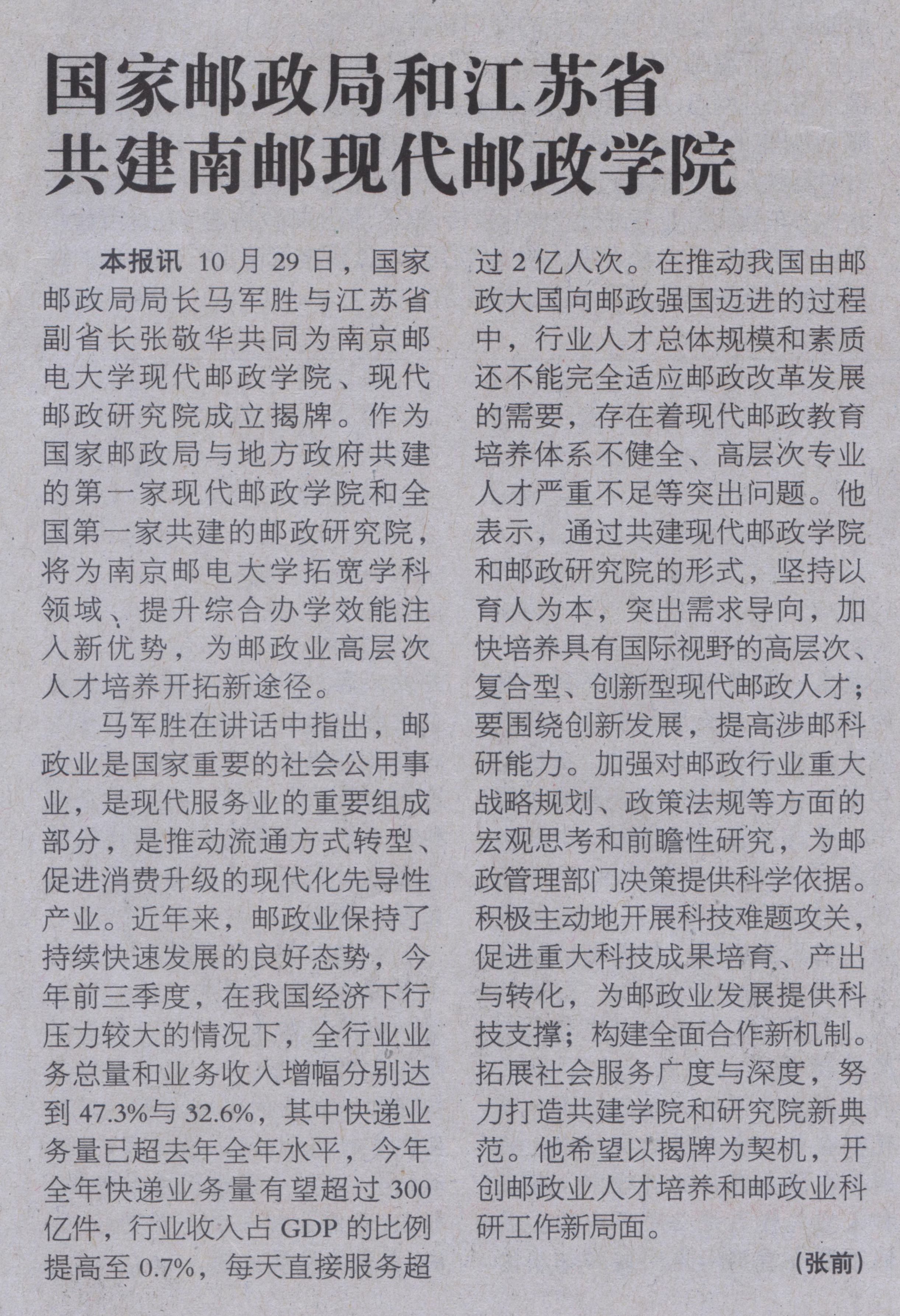 | 【人民邮电】国家邮政局和江苏省共建南邮现代邮政学院 |