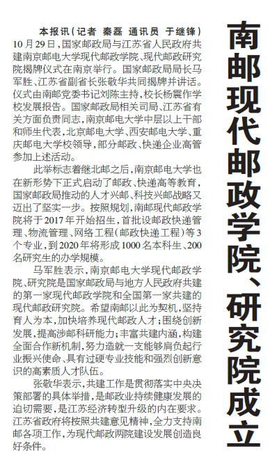 | 【中国邮政快递报】南邮现代邮政学院、研究院成立 |