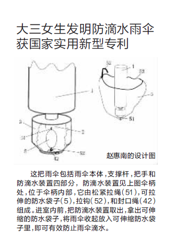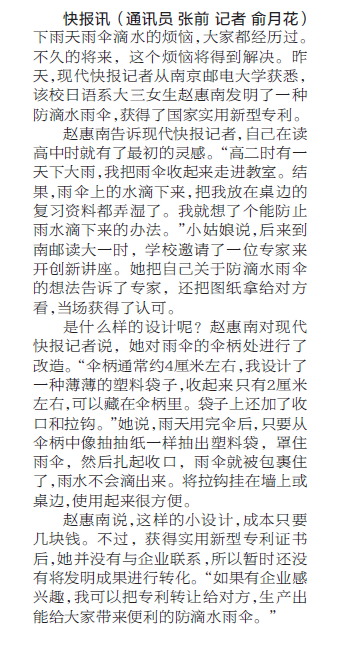 | 【现代快报】大三女生发明防滴水雨伞 获国家实用新型专利 |