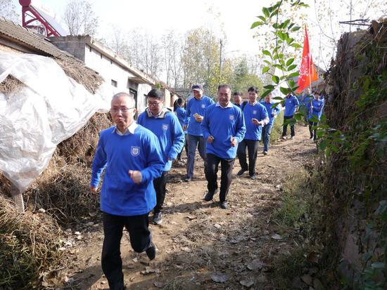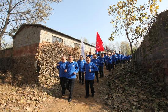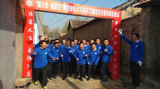 沿着山村里崎岖的道路跑步向前、再向前。摄影:李心电 上午十点整,在办学旧址的大门外,该校杨震校长打响发令枪,“薪火传•踏歌行”校庆健身跑起跑活动开始。大家沿着山村里崎岖的道路跑步向前、再向前。杨震校长介绍,本次活动的路线以山东省临沂市莒南县东甘霖村为起点,以南京邮电大学仙林新校区为终点,途径山东日照市、青州市、济南市等南京邮电大学各时期办学地址,全程约1000公里。整个活动将“现场跑步”和“线上接力跑步”相结合,时间跨度为2016年11月至2017年4月。他还说,举办“薪火传·踏歌行”健身跑是南邮的一项品牌活动,得到了南邮人的热烈响应。74周年健身跑有3200多人参加。75周年校庆健身跑将有万人参与其中。秦华礼老院长用两条腿走完长征,我们要把这样一种百折不挠、自强不息的精神传递下去。通过南邮人接力的方式,心意相连,携手并进,凝聚力量,争创一流学科,跨进全国百强。(通讯员 张前)