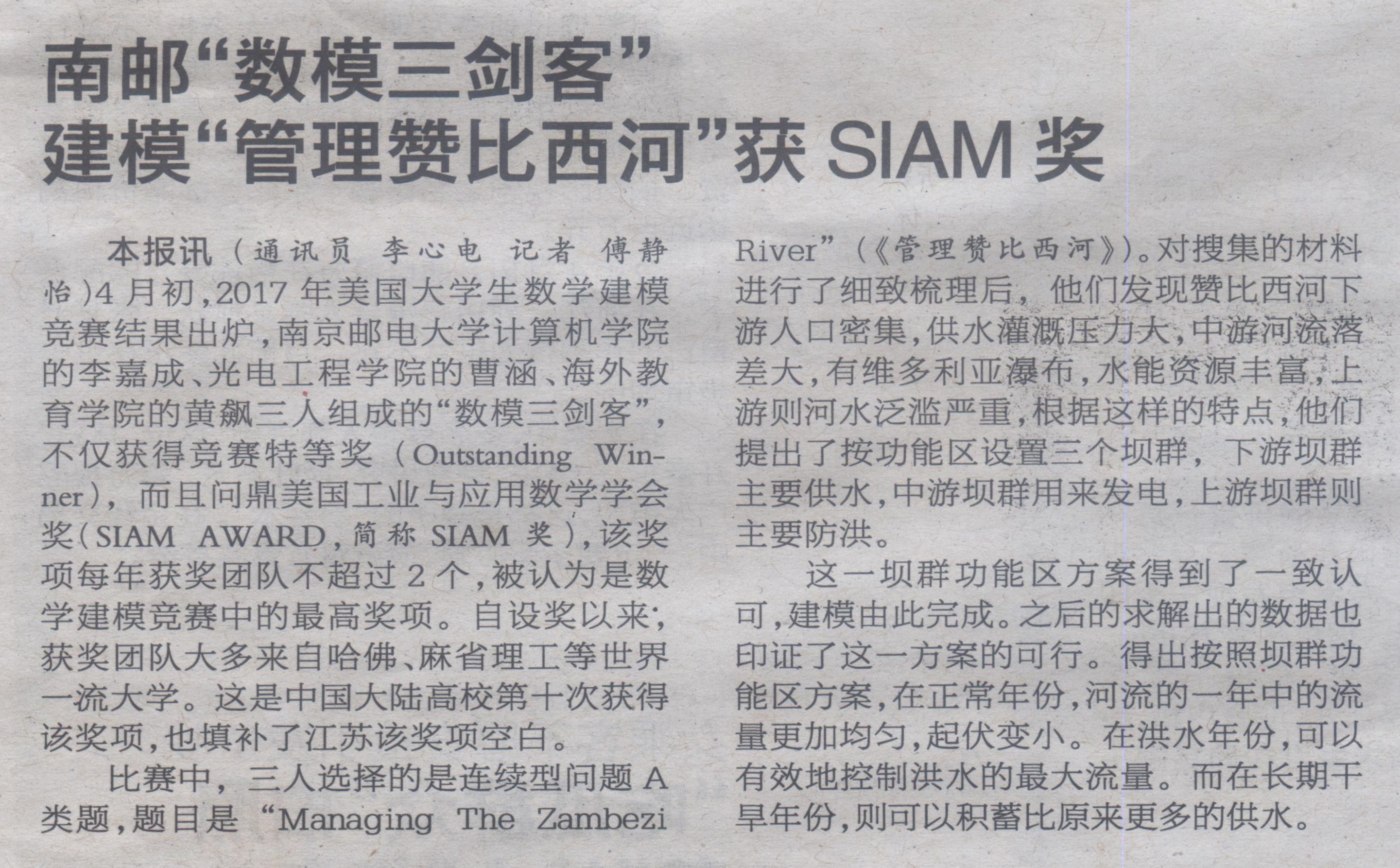 | 【东方卫报】南邮“数模三剑客”建模“管理赞比西河”获SIAM奖 |