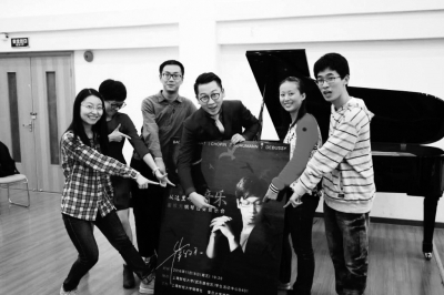 上海财经大学个人音乐会后,崔牧天(右三)与财大、复旦钢琴协会的老师、同学合影留念。崔牧天供图