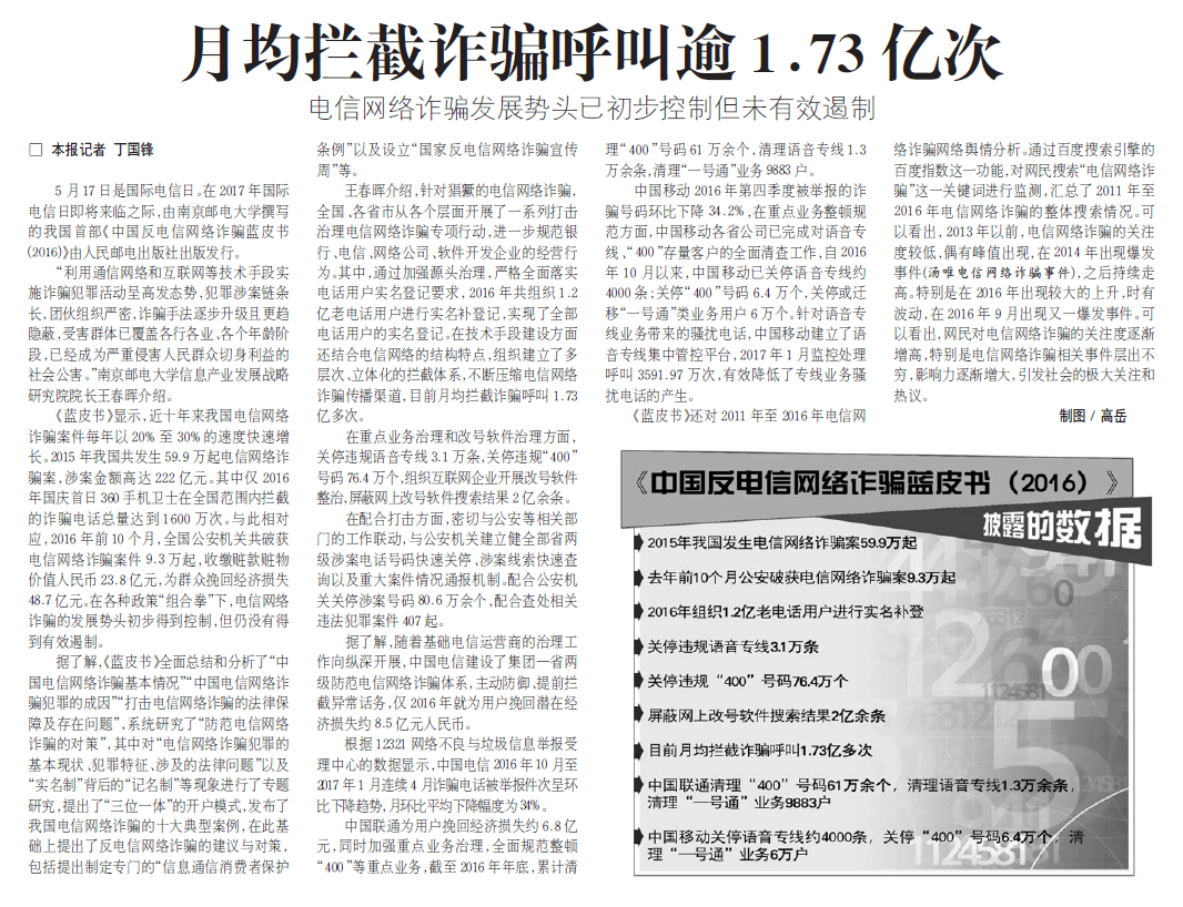 | 【法制日报】月均拦截诈骗呼叫逾1.73亿次 |