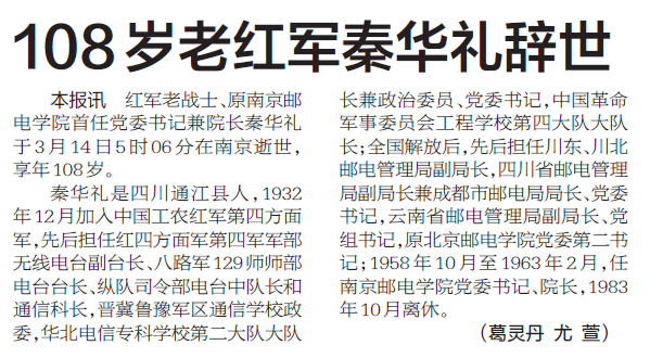 | 【新华日报】108岁老红军秦华礼辞世 |