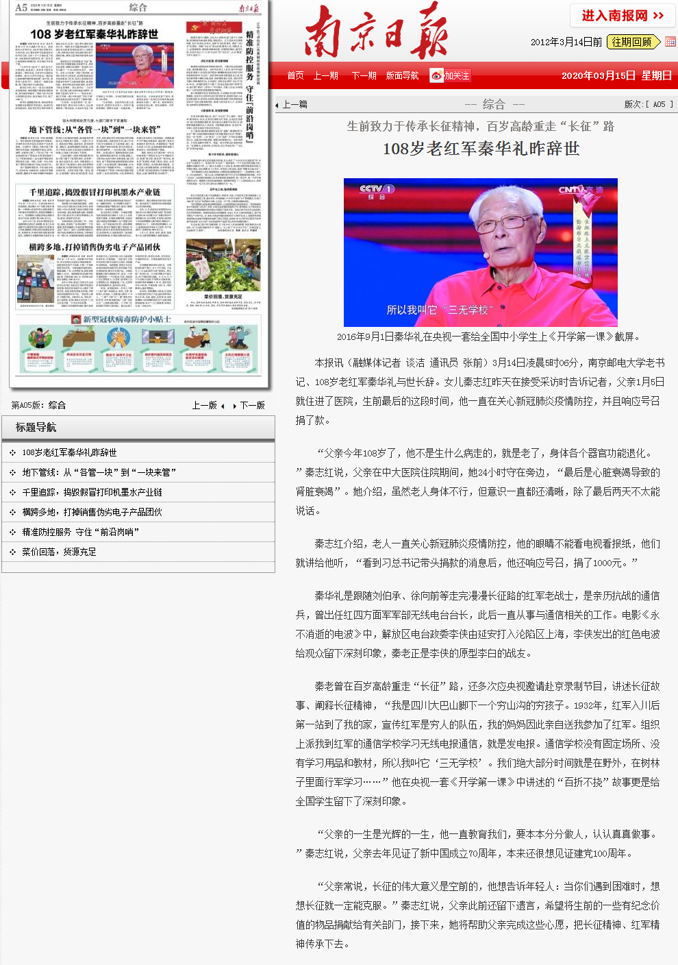 | 【南京日报】108岁老红军秦华礼昨辞世 |