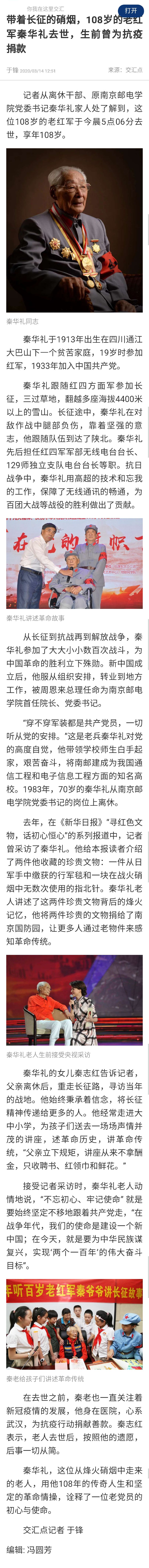 | 【交汇点】带着长征的硝烟,108岁的老红军秦华礼去世,生前曾为抗疫捐款 |