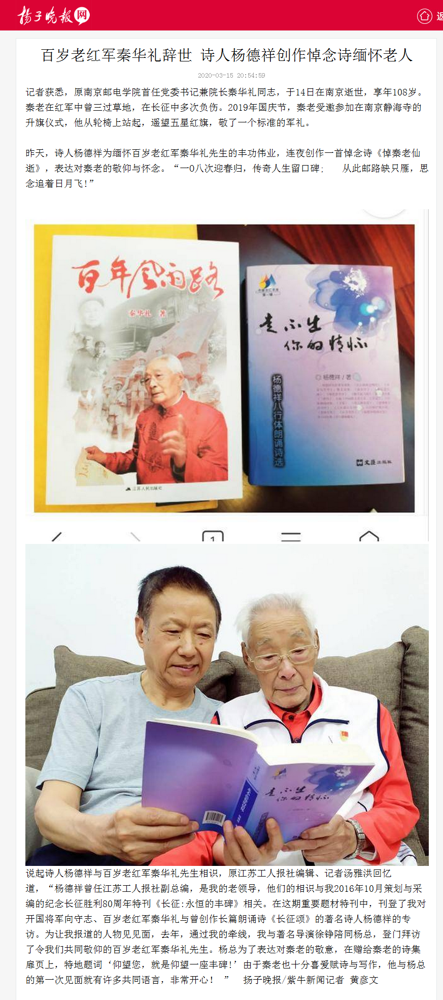 | 【扬子晚报网】百岁老红军秦华礼辞世 诗人杨德祥创作悼念诗缅怀老人 |