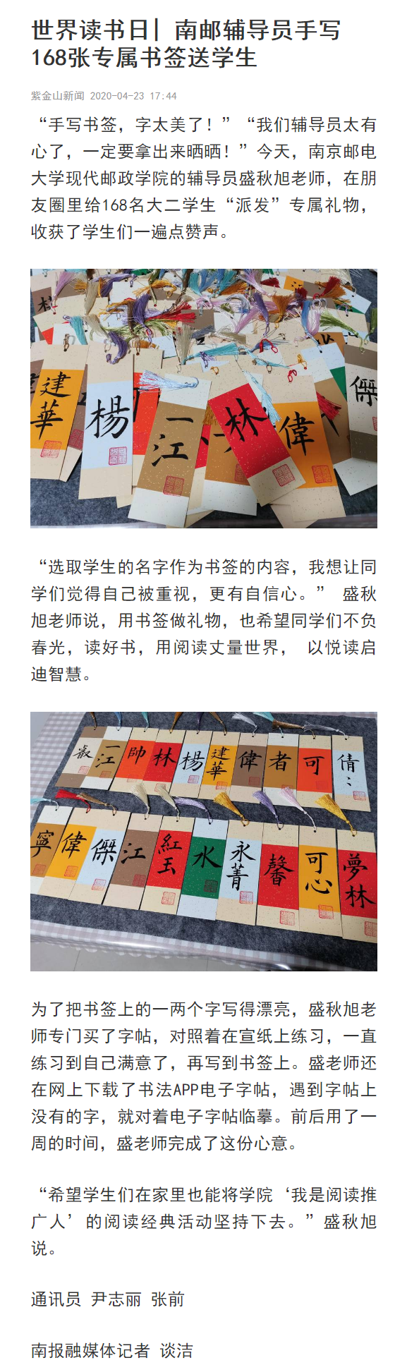 | 【紫金山APP】南邮辅导员手写168张专属书签送学生 |