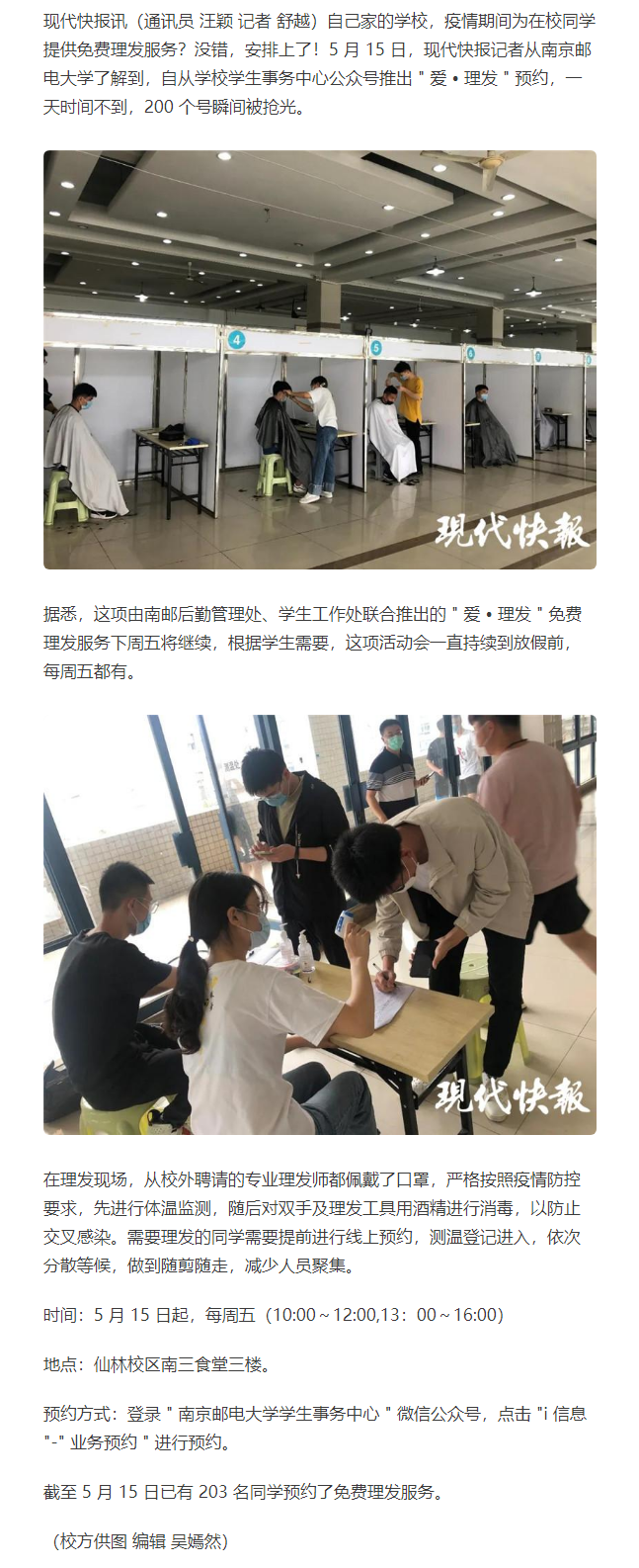 | 【现代快报网】Tony老师来了!江苏这所高校为在校生免费提供理发服务 |