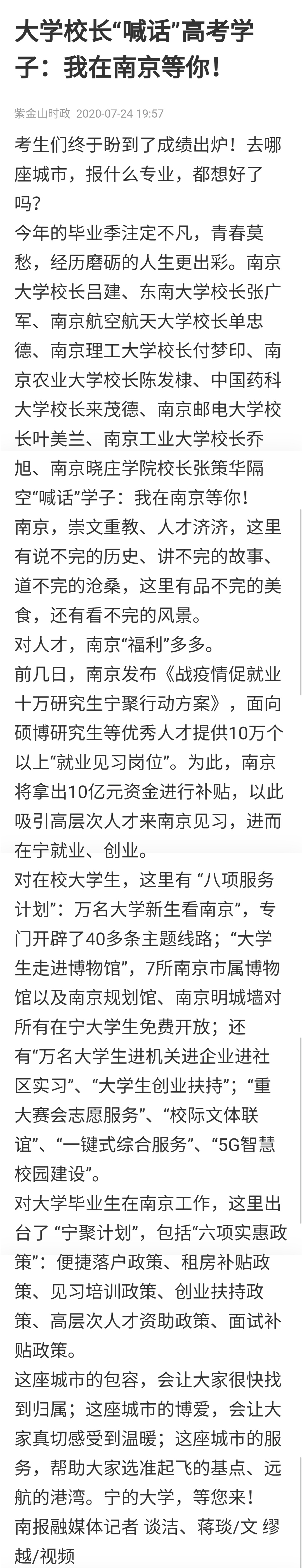 | 【南京日报客户端】大学校长“喊话”高考学子:我在南京等你! |